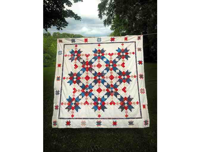 Designed and pieced by Margaret Dobbins and quilted and finished by Willoughby Program Lead and Midwest Deputy Regional Coordinator Diane Wantz, the quilt is a collaborative piece made in honor of the military veterans PHWFF serves. The red, white, and blue stars are on a pure white background. The white-on-white fly-fishing quilting pattern completes the design. This item was donated through the Willoughby, Ohio program.