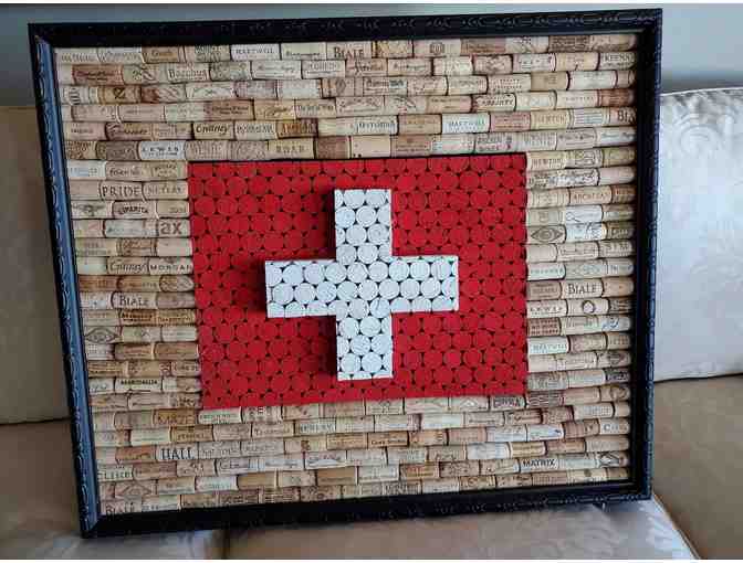 A wonderful handcrafted Wine Cork Board with 3-dimensional Swiss Flag in a handsome black frame.