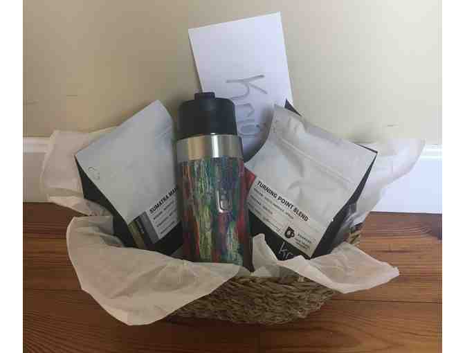 Gift Basket from Kru Coffee including: Two varieties of coffee (SUMATRA MANDHELING and TURNING POINT BLEND), a Travel Mug and a $20 Gift Card