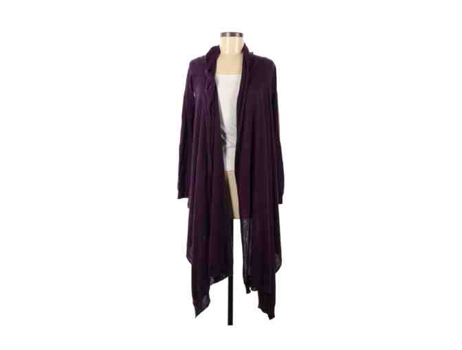 Donna Karan New York signature item, the Cozy cardigan. Can be wrapped or tied 12 different ways! There are videos online with styling tips. Super comfy and classic plum purple long sleeve sweater with a draped collar. Lightweight and very soft silk blend knit. Extremely versatile!