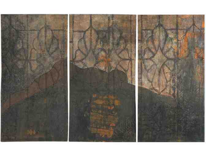 Media: Multimedia (embroidery, rubbing, relief printing) on paper. Triptych. 76”W x 50”H Framed, UV plexiglass.