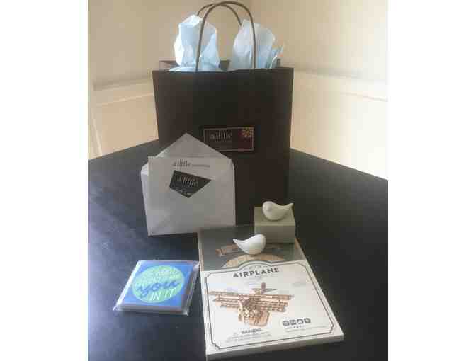 a DIY Wooden Puzzle Airplane, Porcelain Dove Pair, Kindness Bomb Cards, and a Gift Card to A Little Something