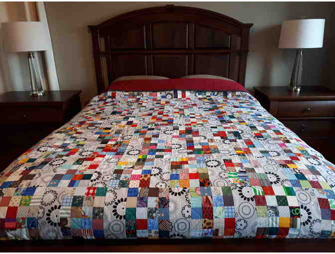 This quilt titled "Sideswiped" was pieced and quilted by Jan and measures 71" x 82". The flannel backing makes it comfy and cuddly, and the combined choices of colour plus fabric will warm your heart!