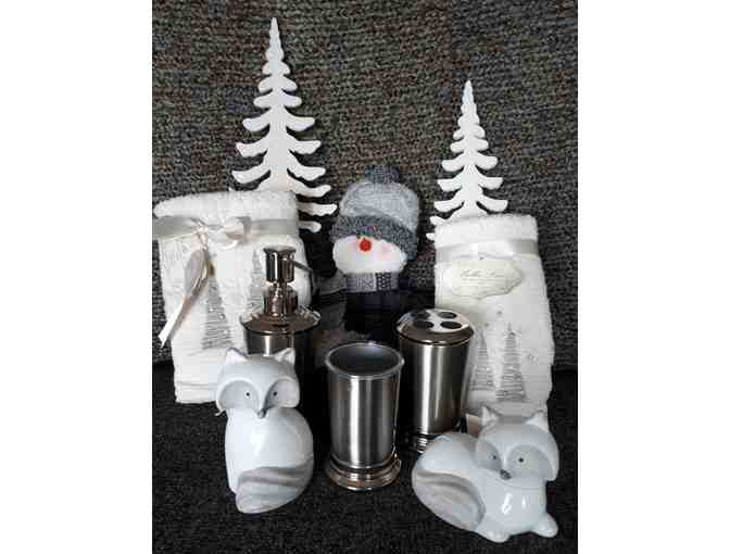 - Two ivory and white snowflake wooden trees (18" and 15" tall)
