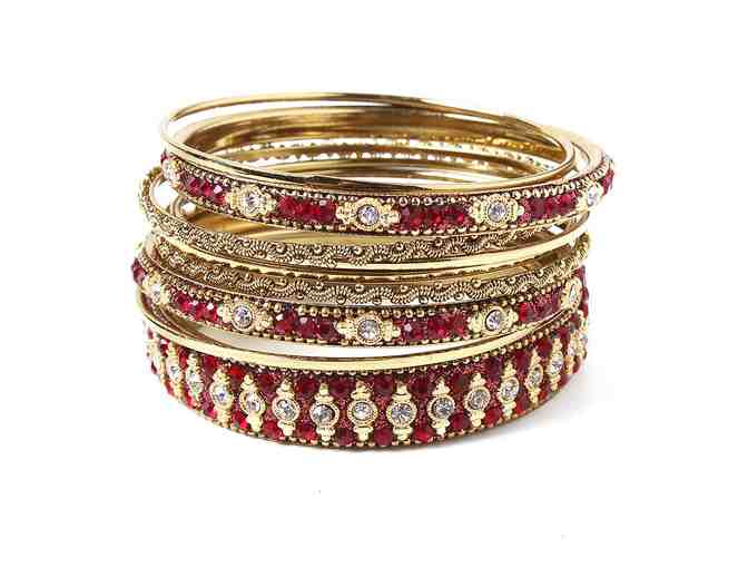 The Glitzy Bangle Set includes a 9-piece, mix-and-match set of beautifully engraved gold-tone brass and Austrian crystal encrusted bracelets for that extra sparkle. Each individual bangle in this set has its own unique characters and details. Pair them up or wear them on their own, either way you're sure to shine bright this holiday season!