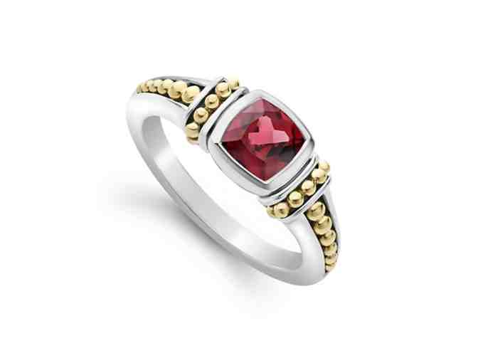 LAGOS designer ring! Gemstone rhodolite garnet ring surrounded by sterling silver and 18K gold Caviar beading. Garnet gemstones are natural with unique hues.