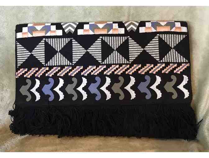 Stella & Dot canvas black clutch with white, pink, and olive toned embroidered design on the front with fringe along the edge. New with inner tag. Magnetic closure and card pockets on the interior.
