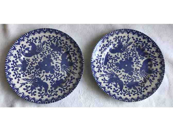 Set of 2 antique Nippon 6” blue and white Phoenix and flowers 6 inch dessert plates. One has a slight flaw on the front (see pictures) but otherwise both are in great condition. This would make some lovely decor or could be used as fancy desert plates.