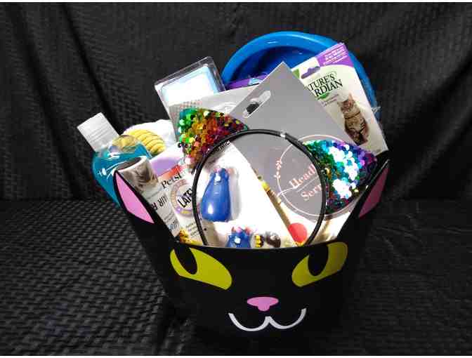 Who says black cats are bad luck? This kitty basket is filled with toys, treats and a few tricks for your favorite feline. Package includes rainbow kitty ears, computer screen cleaner, tiger play toy, cat bowl, pooper scooper, cat grooming brush, cat shampoo, ball spin toy, and cat food.