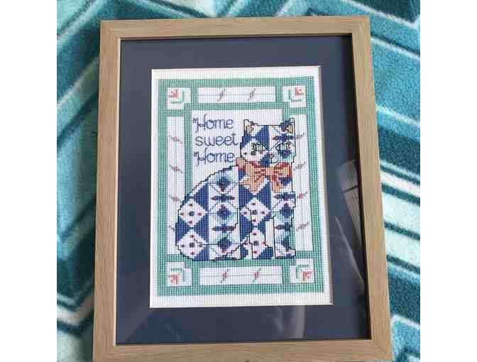This adorable framed stitchwork of a cat and "Home Sweet Home" was made by the super talented Holly Fawcett of Holly's Enchanted Stitches. Framin by B & J Framing. This masterpiece would be a perfect addition to any home.