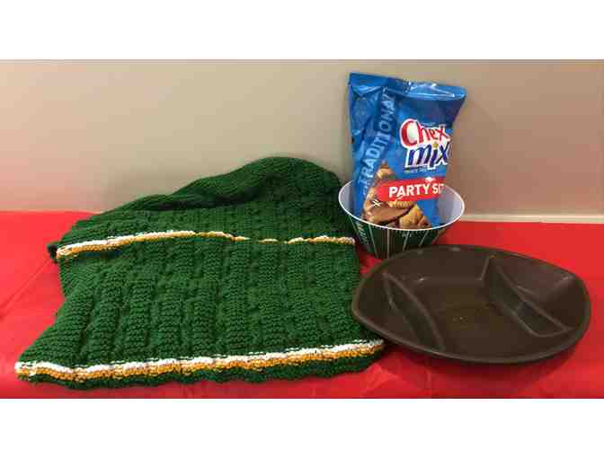 Football season has started again! Watch the Packers with this handmade green and gold afghan, football serving tray, football bowl and a party size bag of Chex Mix.