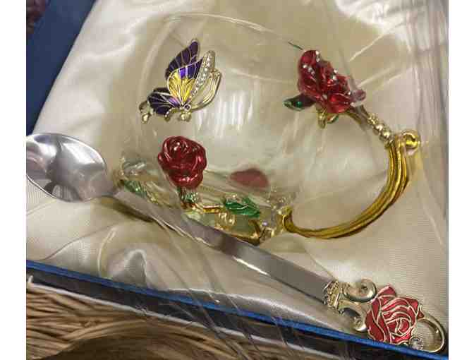 Beautiful basket with 2 decorative tea cups and spoon, Blanket and candle