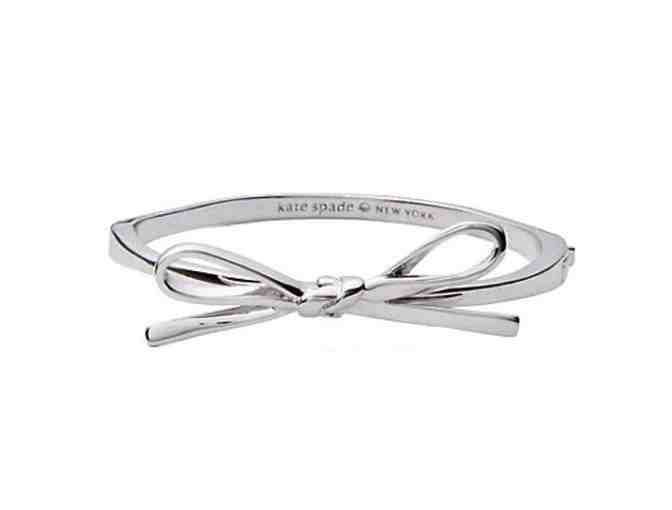 New Kate Spade NY bow bangle in silver. Signature engraved inside. Hinged closure. In original Kate Spade logo drawstring pouch.