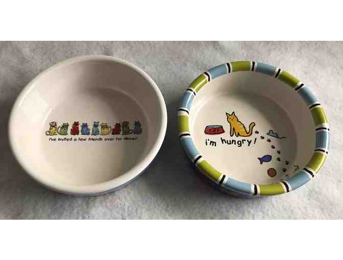 These 2 stoneware cat food/water dishes are made by Room Creative. One is called "My Friend" and is circa 2009. The other is called "Run Kitty Run" and is circa 2007. Excellent condition. Appears to have never been used.