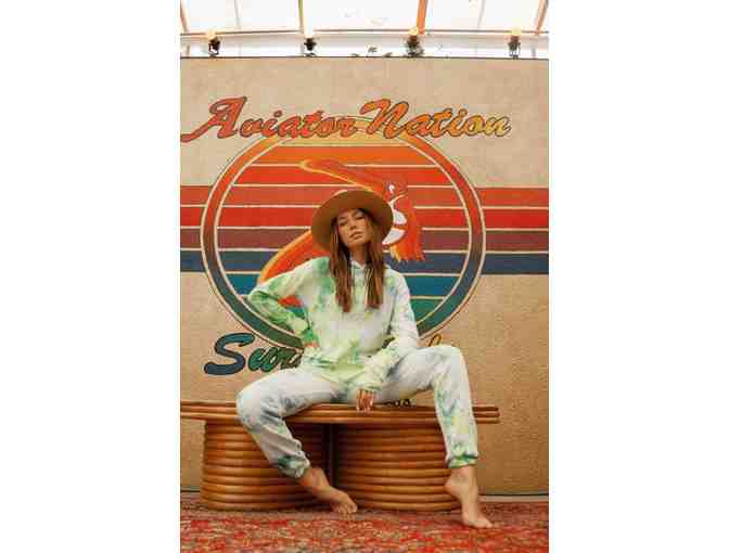 Amazing bag of goodies from Aviator Nation in San Francisco including sweatshirts, sweatpants, tees, koozies, stickers, and a tote! Aviator Nation makes super comfortable stylish attire that is colorful and fun for the whole family.