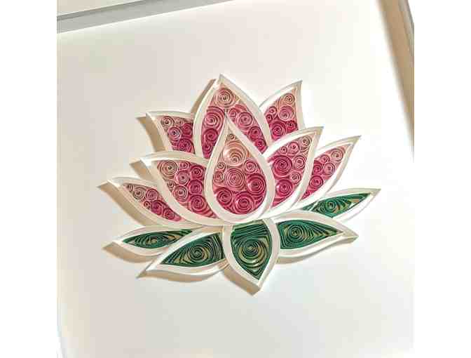 Paper quilled pink ombré lotus flower artwork. Comes in a white 12x12 shadow box frame. Can stand on a shelf or be hung up. Would make zen and peaceful addition to decorate any space.