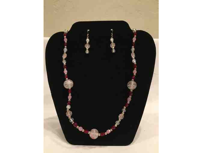 Necklace and earrings made of pink, raspberry, and crystal Czech glass beads. Necklace is 26".