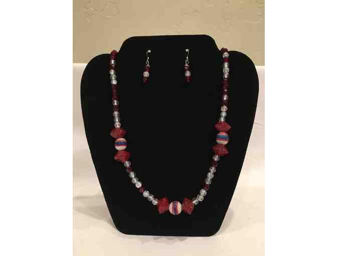 Necklace and earrings made of red, white, and blue striped Czech glass beads, complimented with burgundy and crystal beads. Necklace is 26".