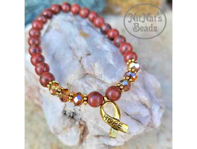 6 mm red jasper semi-precious stone beads, amber faceted glass rondelles, and gold toned alloy accents and hope ribbon charm. Valued at $21