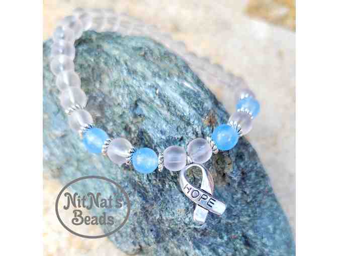 6 mm frosted clear quartz and 6mm aquamarine semi-precious stone beads, and silver toned alloy accents and hope ribbon charm.