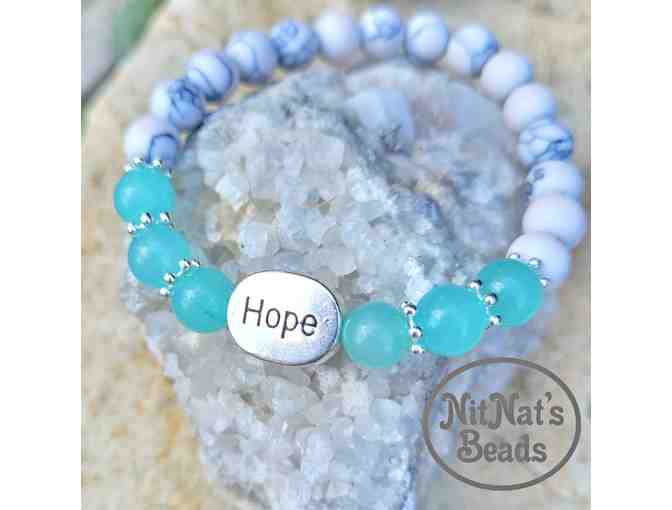 8 mm frosted white turquoise and 8 mm blue jade semi-precious stone beads, and silver toned alloy accents and hope bead charm