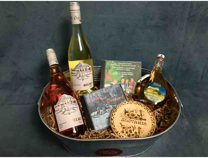 1 bottle Hel'pa honey wine, 2 bottles of Belko wine, a small family winery in Slovakia (2018 Chardonnay, 2018 Pinot Noir Rose), a decorative snack plate with wood-burned folk imagery, and 2 CDs: Treasured Czech & Slovak Christmas Carols featuring vocalists Jozef and Dodo Ivaska, and Bob Petrik on accordion; and Songs and Dreams, an artistic collaboration of poetry by Msgr. Wenceslaus C Hradecky and music by Rosanne L. Malek.