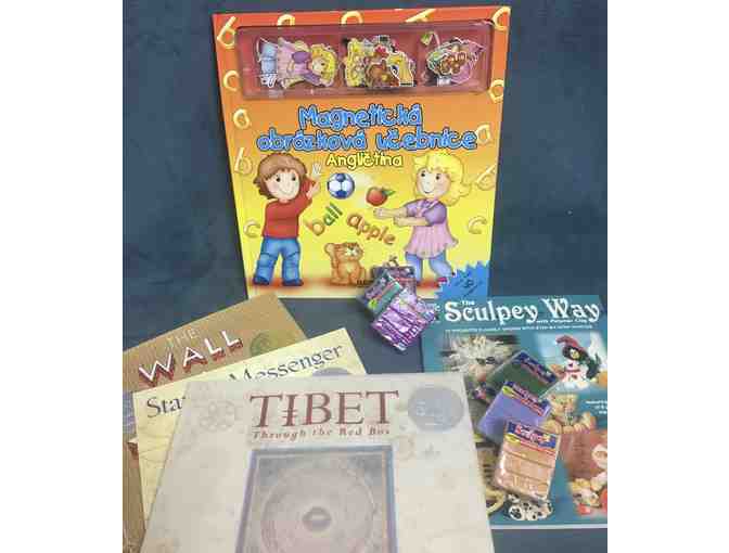 This collection will keep the kids engaged not just for hours but for days! Included is an alphabet and simple word book in both Czech and English with magnetic, moveable characters which kids can place at will on the magnetic pages. Also included is a selection of polymer clay (nontoxic/kid safe) and a polymer clay activity book. Rounding out this collection of guaranteed entertainment are 3 picture books by Peter Sis: Tibet Through the Red Box; Starry Messenger; and The Wall.