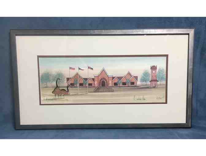 P. Buckley Moss is known widely for her paintings of folk life, and in 1988 was referred to by journalist Charles Kuralt as "The People's Artist." This print of a painting Moss did of NCSML's iconic building in its original home on the Cedar River's west bank is #103 in an edition of 500 prints produced in 1999. This rendering includes the NCSML clock tower as well as the American, Czech and Slovak flags. While all her prints include a signature, this one was personally signed and also initialed at the edition number. Framed size is 26 x 14.5".