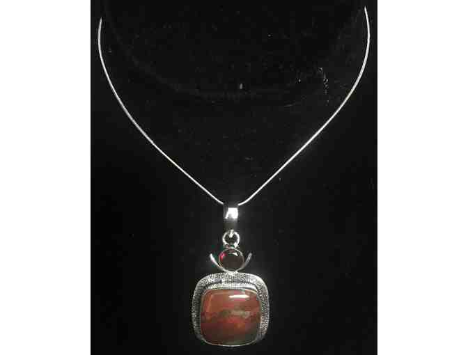Set in sterling silver, this square Montana (red) agate is accompanied by a garnet solitaire to create a necklace of unique integrity.