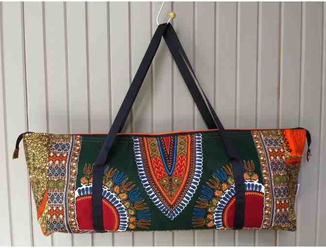Show your yoga mat some love with this functional and stylish one of a kind yoga mat bag. African print on the front on a rust color denim on the back makes it sturdy and durable. Both fabrics are 100% cotton and seams are serged for a clean finish inside.