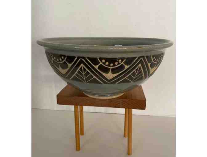 The dark lustrous glaze and carved slip decoration on this functional stoneware is created with native clay dug from the banks of Vermont rivers.