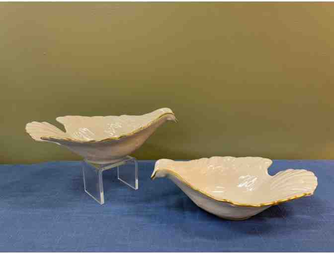 These two Lenox ivory porcelain bird dishes can be used for candy, nuts, mints, change, potpourri, you name it. Trimmed in 24K gold. Made in the USA. Each bird is 7.5" long and 4.5" wide.