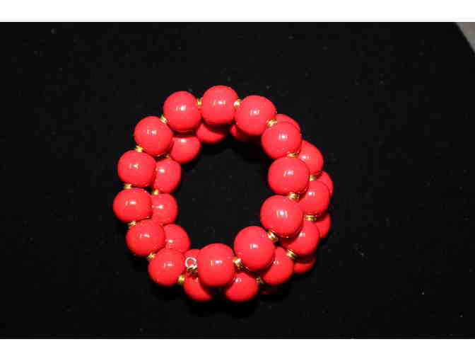 This coiled, red bead bracelet is handmade in Kenya. The Kazuri company only hires single mothers and pays them a livable wage with benefits, which is not so common in Africa. The women form the beads from river clay, fire, paint and glaze, then string them into necklaces, earrings and bracelets.
