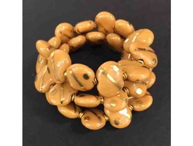 This coiled bead bracelet is handmade in Kenya. The women form the beads from river clay, paint, fire, glaze and string the beads into necklaces, earrings and bracelets.