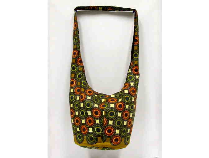 Great for everyday travel to and fro, this light-weight, easily compressible, hobo-style bag is perfect for the woman on-the-go. Colors of beige, dark green, dark red, yellow and orange come togethr in this circular design.