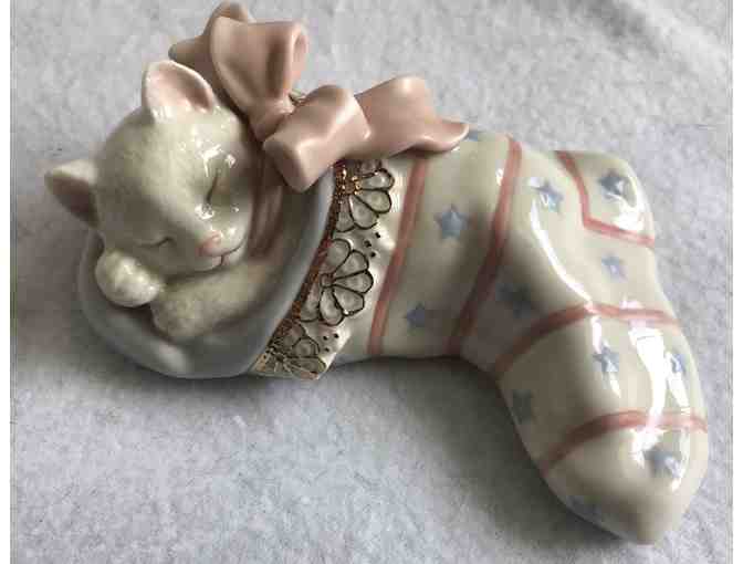 This adorable Christmas decoration features a little white cat with a pink bow sleeping peacefully in a white socking with pink, blue, and gold accents. This items is in excellent condition and comes with the official collection card from Lenox.