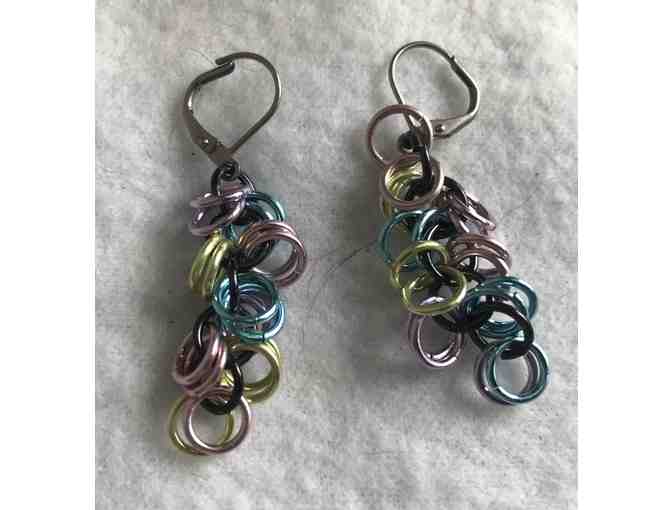 These cute earrings are made from light colored chainmail and have a surgical steel leaverback. Great for those with allergies to other metals. Approx 3 in long