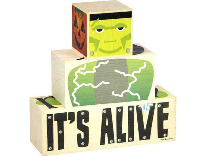 Three-block sets to get into a seasonal mood! The bottom block measures 8.25" long x 2.75" square. Printed on four sides with different messages when rotated. Four "monsters" are shown - Frankenstein, a black cat, a jack-o-lantern, and a skeleton. Mix and match the sides for more combinations! Crafted from locally-sourced, responsibly-harvested pine.