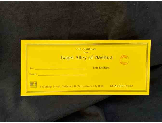 A $10 Gift Certificate to a Nashua staple. Bagel Alley is a family run bagel shop for more than 30 years with 16 different flavors of fresh made daily bagels and 7 different schmeer's.