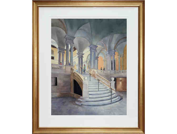 Framed original 22"x17" watercolor, depicting the Sculpture Court gallery of The Walters Art Museum.