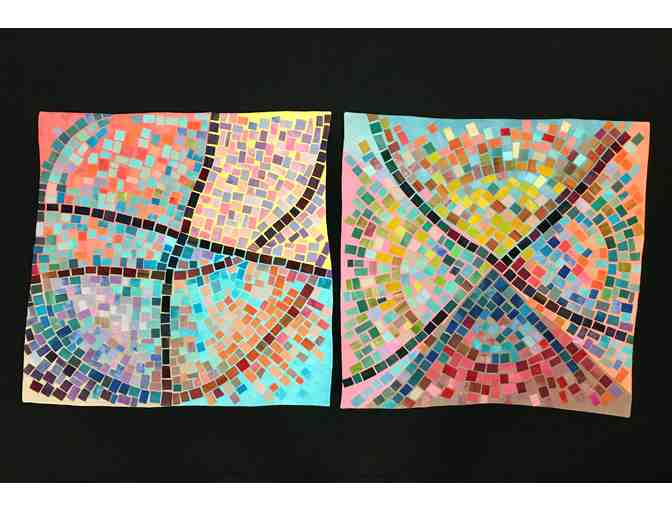 Colorplay VI and Colorplay VII, by artist Anne Lullie, were hand-selected by the artist to be sold as a pair. Lullie has explored many artistic disciplines but found her true calling in the textile world. Each quilt is designed and executed entirely by the artist, including hand-dying of the fabrics and threads. While vibrant color is inherent in Lullie's work, her Colorplay series was initiated to test the boundaries of how much color differentiation could be included in a single work.