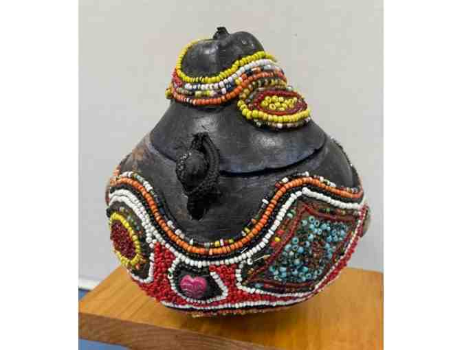 This decorative hiding place began its life as a common gourd. It was hollowed out, dried and reworked into a lidded vessel. Seed beads and cowry shells adorn the outside and were strung and attached by hand. It stands 5" tall.