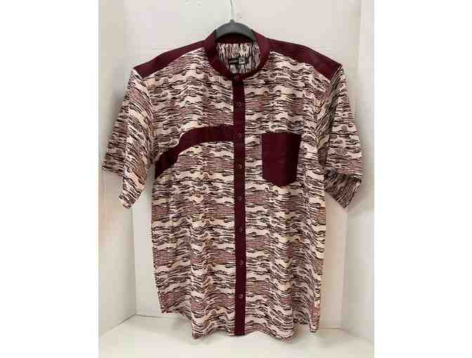 This cotton two-tone shirt will keep you cool on hot days. It is size M-L. This shirt was designed and manufactured by one of our WMI Scholars who started his own clothing company in Ghana and employs people in the area.