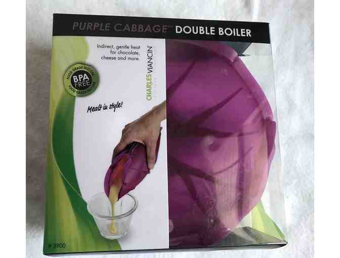 The Charles Viancin purple cabbage double boiler is sure to brighten your day and is perfect for melting, steaming and reheating. These silicone double boilers are totally flexible and makes storing in tight spaces possible and clean up easier. Fun and functional for all of your kitchen activities, these original designs will remind you of one of nature's most basic truths: the freedom to create.