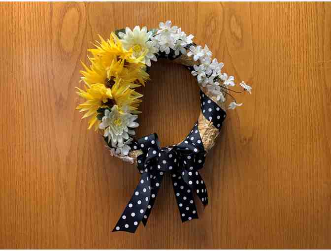 This 12x12 Spring wreath has bright cheerful flowers with a touch of fun polka dots to add a bit of cheer to any door.
