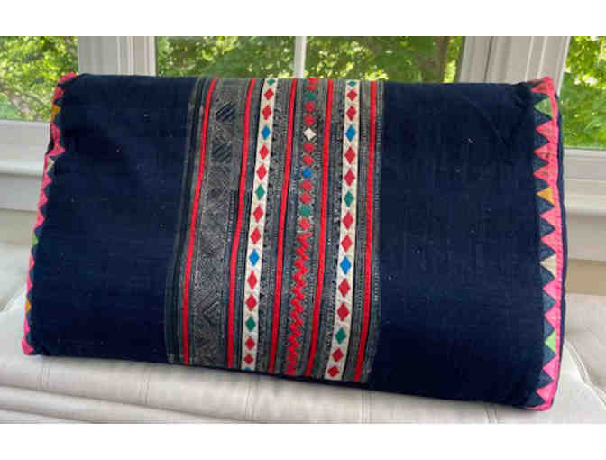 This triangle-shaped bolster is of a style that, in Thai silk, could have once graced a fine room in a 19th-century Thai palace. Its modern version, with its indigo cover decorated by one of Thailand's hill tribes, could be used right on the floor of a children's playroom or family room. A perfect gift! 29 inches long, 17 inches wide at the base, and 18 inches tall at its peak.