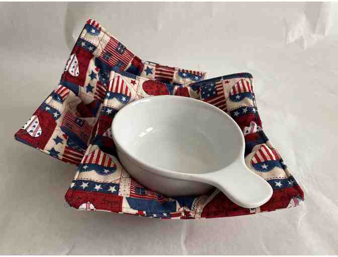 Set of two bowl cozies in a patriotic pattern. These cozies are used to cradle your bowl or HOT soup or COLD ice cream to keep your hand comfortable while you eat. The cozies are microwave safe and help to protect your hands from hot bowl while heating up your food.