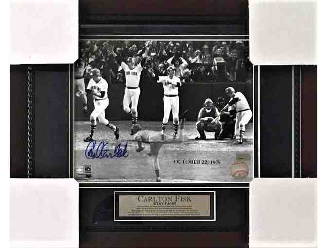 Carlton Fisk Autographed “Stay Fair” Framed & Matted 11×14 depicts Fisk famously encouraging his game-winning home run to land fair during the 12th inning of Game 6 of the 1975 World Series against the Cinncinati Reds.