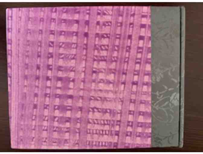 Blank book is 100% handcrafted and hand stitched by Denise Joy Slobodnik of Alto Clef Press. All materials used are acid free abd archival. The Paste Paper on the cover boards was created originally for this book. The Book Cloth is Japanes brocade backed by paper. The body text paper was saved from the recycle bin of Mendo Litho in Fort Bragg, CA. Since the paper was used to be used as wine bottle labels it has what is called " wet strength" and so can be used for pen and ink or water color sketches. Of course all other implerments of writing will work as well.