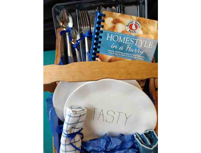 Remodeling takes a lot of time and money. Here is a basket that will transform your dining room in a flash. It features new cutlery, plates, kitchen towels and a cookbook filled with new inspiration.